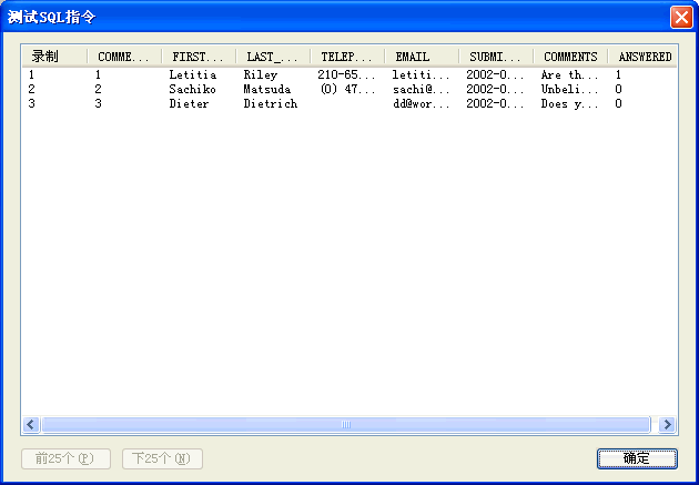 在“测试 SQL 指令”窗口中显示来自与您的记录集或数据集选择条件匹配的数据库的记录。