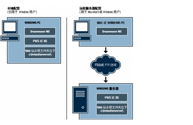 本节提供两种常见系统配置的说明 - 其中一种情况是 Microsoft IIS 或 PWS 安装在您的硬盘上,另一种情况是 IIS 或 PWS 安装在远程 Windows 计算机上。如果您不想使用这些配置,请参见设置 Web 应用程序。
