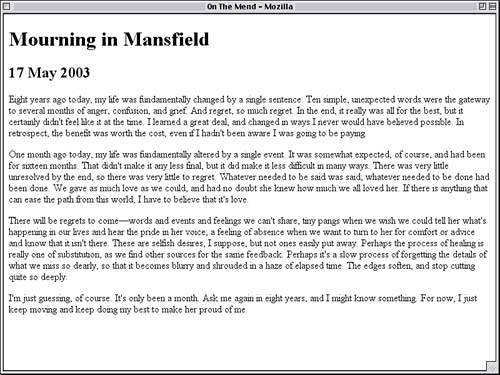 Style at DawnFor the first half of this project, we'll take the first of the two documents and add the styles necessary to create translucent effects using ordinary JPEG images. As we'll soon see, the images in question make it fairly easy to create an attractive design. Getting StartedAs usual, our first step should be to look at the structure of the document. As we can see from Listing 4.1, there isn't a whole lot to it really, just a masthead div with a heading and a "main" div containing the text of the entry. Without any styles, we get the very plain rendering shown in Figure 4.1. Listing 4.1. The Basic Document Structure<div id="masthead"> <h1>Mourning in Mansfield</h1> </div> <div id="main"> <h2>17 May 2003</h2> [...entry text...] </div> Figure 4.1. The journal entry in its unstyled state.