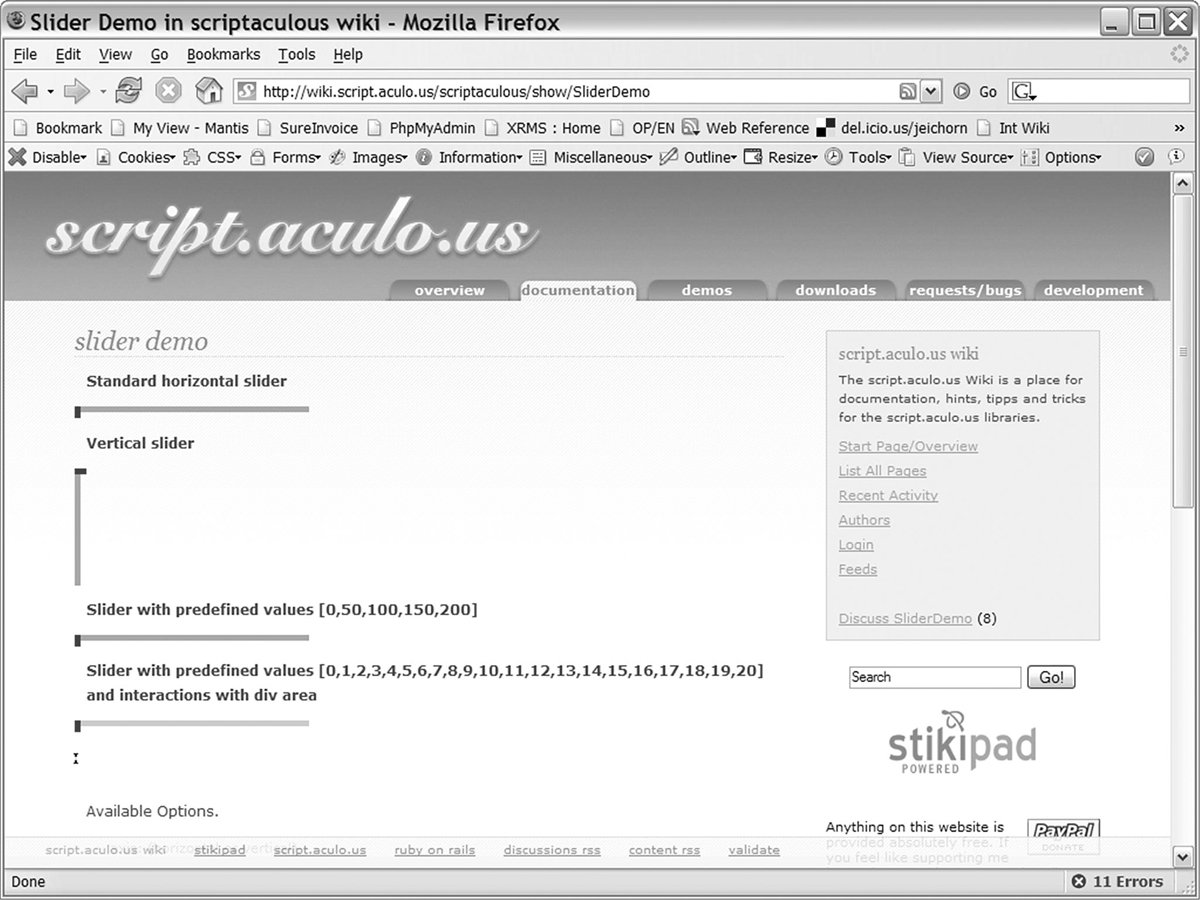 Like the rest of the scriptaculous examples (Listings 8-98-11), this page includes the JavaScript library files in its header (lines 47). After that, the HTML for the sliders is laid out: first the horizontal slider (lines 1123) and then the vertical slider (lines 2537). Both sliders follow a similar pattern; first the slider track is defined, setting its ID, width, height, and color (lines 1215 and 2629). Then, the handles for the sliders are defined (lines 1621 and 3035). The handles set most of the same basic style elements as the track, adding a cursor of move for improved usability. The HTML definitions are finished by creating empty DIV elements to display the current value of the slider (lines 23 and 37). The next section of the page is the JavaScript that turns these DIV groups into sliders. We start this process by assigning the debug DIV elements to variables so that we can easily reference them later (lines 4041). Then we create a slider instance for the horizontal slider control (lines 4346). The Control.Slider function takes three parameters: the track element, the handle element, and any options. In this case, we are setting two options: the onSlide and onChange event handlers. The onSlide handler is called as we move the handle around; the onChange handler is called when we're done dragging the handle. The onSlide handler is usually used to provide feedback, whereas the onChange handler is used to make the value of the slide accessible to other parts of the page, storing its value in an input box or JavaScript variable. Lines 4852 follow much of the same process for the vertical slider. In this case, we set an extra option, axis, to the value of vertical setting. This does what it suggests and makes the slider work in a vertical fashion. We also translate the value of the slider to a 0100 scale in the onSlide and onChange handlers. 8.4.7. Scriptaculous Development TipsScriptaculous contains functionality for creating visually impressive Web sites. While using it, keep these tips in mind: