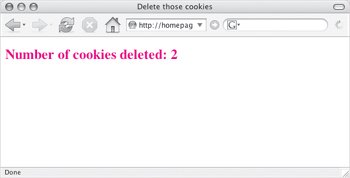 The script is out of the for loop now, and this line sets the number of cookies deleted in the HTML document ( Figure 10.7).