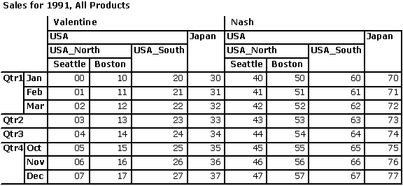 x 轴有两个嵌套维:Salesperson 和 Geography。从 Geography 中,选择了四个成员:Seattle、Boston、USA-South 和 Japan。从 Salesperson 中选择的两个成员是:Valentine 和 Nash。因此,在该轴上总共产生八个位置 (8 = 4*2)。