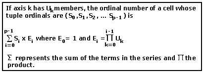 单元的序号值用于唯一标识单元集中的单元。从概念上讲,单元集中单元的编号如同将单元集作为一个 p 维的数组,这里 p 是轴的数目。单元按以行为主的顺序从零开始编号。计算单元序号的公式为: