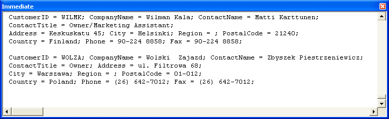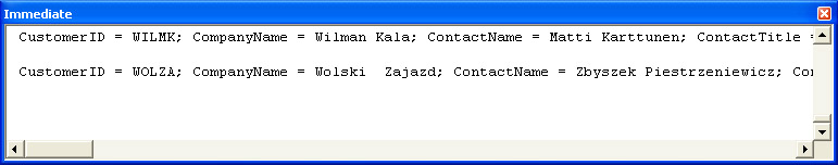 Figure 1-4 shows the last two rows of output. You can scroll right in the Immediate window to view the whole record, but it would be more convenient if you could see the whole record without having to scroll the window.