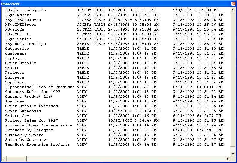 When used with a parameter set to adSchemaTables, the OpenSchema method outputs a recordset of table properties with information ordered by table name. However, this list mixes information about all types of tables in rows adjacent to one another. Therefore, it is difficult to find information about a particular user-defined table, view, or system table. Figure 1-7 shows the output to the Immediate window from a VBA program that sorts tables by table name, within table type. Along with the other two columns, this feature makes it easy to look up when a table was last modified or created.
