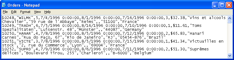 To demonstrate how this process works, you can export a table or two (such as the Northwind Orders table) from the Access database to create a suitable source for importing. Figure 3-8 shows the first several rows of the Orders table as a text file named Orders.txt. Notice the file has a typical comma delimited-format delimited with quotes around text fields. This is a common format for many text files. The whole file corresponding to the Orders table is also provided for you in the companion content for this book. The lines can wrap in Notepad view.