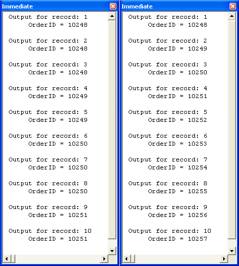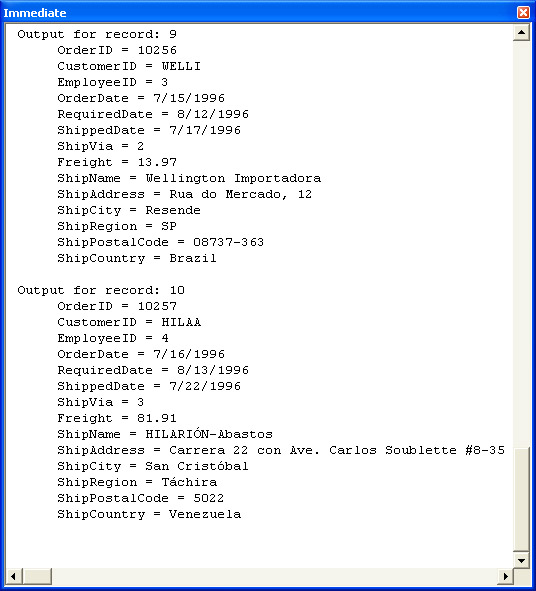 Figure 4-1 presents an excerpt from the output generated by running this code sample. This screen shot of the Immediate window shows the output from the last two records. The Northwind database contains 830 records in its Orders table, but the second procedure limits the rows processed to the first 10 rows. However, the procedure does print values for all the columns available on each row. Each row's output starts with a header label. Then, the procedure shows each column's name and value separated by an equal sign (=).