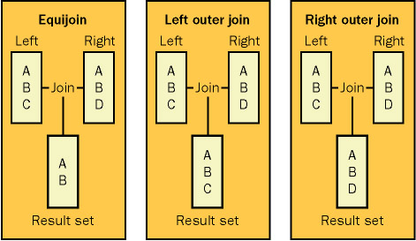 Figure 4-4 contrasts three join types: equijoins, left outer joins, and right outer joins. All three joins in the table join the same left and right tables. The left and right tables have two records with matching join field values: A and B. The left table has a join field value, C, that does not match any join field value in the right table. Similarly, the right table has a join field value, D, that does not match any join field value in the left table. The equijoin generates a result set with just two records having join field values of A and B. The left outer join includes three records in the result set whose join field values are A, B, and C. The right outer join also includes three records in its result set, but the join field values for this result are A, B, and D.