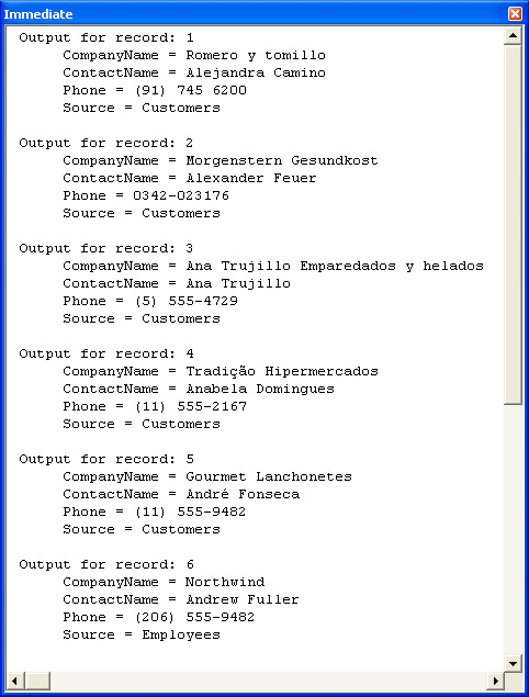 Sub SelectThreeTableUnion() Dim strSrc As String Dim strSQL As String 'Concatenate Supplier contact info after employees contact info. 'Sorts by default on first column. strSQL = "SELECT CompanyName, ContactName, Phone " & _ "FROM Customers " & _ "UNION " & _ "SELECT CompanyName, ContactName, Phone " & _ "FROM Suppliers " & _ "UNION " & _ "SELECT 'Northwind', " & _ "FirstName & ' ' & LastName AS ContactName, HomePhone " & _ "FROM EMPLOYEES" PreviewRecordsetSource strSQL End Sub