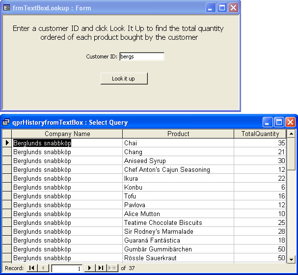Figure 5-17 shows a form that opens the qprHistoryfromTextBox query when the user types a customer ID in the text box and clicks Look It Up. The query finds the total quantity ordered of each product bought by that customer.
