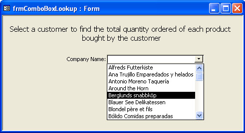 SELECT Customers.CompanyName, [Order Details].ProductID, Sum([Order Details].Quantity) AS TotalQuantity FROM (Customers INNER JOIN Orders ON Customers.CustomerID = Orders.CustomerID) INNER JOIN [Order Details] ON Orders.OrderID = [Order Details].OrderID WHERE Customers.CustomerID=Forms.frmComboBoxLookup.cboLookup GROUP BY Customers.CompanyName, [Order Details].ProductID