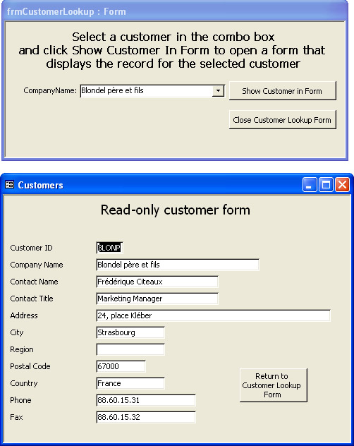 You can display data, such as a record, in a form, and you can even design a form so that users can view the record but not edit it. Figure 5-20 shows a pair of forms that work together to let the user view a customer's record. The user selects a customer in the frmCustomerLookup form and clicks the Show Customer In Form button to open the Customers form, which displays the customer's record. (The Allow Edits, Allow Deletions, and Allow Additions properties of the Customers form are set to No, which prevents the user from changing the data.) The user can then click the Return To Customer Lookup Form button to transfer control back to the initial lookup form. The user can also launch another lookup or exit the application from this form.