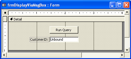The form that displays the result set from the parameter query in a message box has three controls—text box, its matching label, and a command button (see Figure 5-21). A user inputs a CustomerID code into the text box and clicks the command button. The click starts the presentation of one or more message boxes that display the orders for the customer corresponding to the CustomerID in the message box.