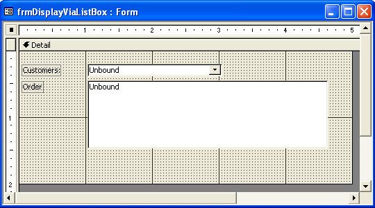 Private Sub Form_Load() 'Initialize cboCustomers control With cboCustomers .RowSource = "SELECT CustomerID, " & _ "CompanyName FROM Customers" .BoundColumn = 1 .ColumnCount = 2 .ColumnWidths = "0 in; 1.75 in" .Width = 2880 End With 'Assign Value List as RowSourceType property 'for lstOrders lstOrders.RowSourceType = "Value List" 'Format form Me.Caption = "Show orders for customer in a list box" Me.RecordSelectors = False Me.DividingLines = False Me.NavigationButtons = False End Sub Private Sub cboCustomers_AfterUpdate() Dim rst1 As ADODB.Recordset 'Open recordset based on selection for 'cboCustomers Set rst1 = LookupOrders(cboCustomers.Value) 'Clear prior RowSource property setting 'for lstOrders lstOrders.RowSource = "" 'Loop through the result set from the parameter 'query and form a string for display in listbox 'control Do Until rst1.EOF str1 = rst1("CustomerID") & ";" & _ rst1("OrderDate") & ";" & rst1("OrderID") lstOrders.AddItem str1 rst1.MoveNext Loop End Sub