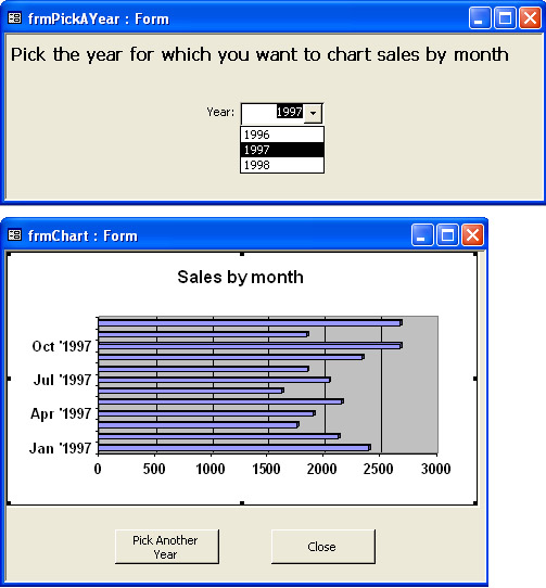 Figure 5-23 shows two forms that let the user chart sales for a selected month. The top form lets the user select any year in the Orders table. The combo box's AfterUpdate event opens the bottom form, which uses the Microsoft Graph 2000 Chart object to display total sales quantity by month for the specified year. In Figure 5-23, the chart is based on a query that retrieves all orders from the specified year. The query translates each order date to the first of its month. (The underlying data remains unchanged.) This makes it simple to aggregate sales quantity by month, which in turn makes it easy to chart sales quantity by month. (The Chart Wizard automatically sums sales quantity by month for a record source such as this.)