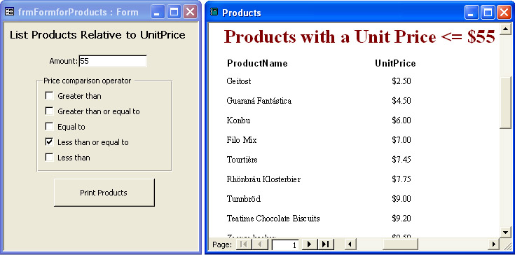 Figure 6-27 shows a form and a report. Users can manipulate the form to change the content for the report. The form includes a text box, an option group of five check boxes, and a command button. After entering a number in the text box and selecting a Price Comparison Operator, the user can click the command button to open the report shown on the right in Design view. Recall that this view is necessary to persist changes to the property settings for the form and its controls. The sample code in this case assigns a new Record Source property and updates the Caption property for the label that displays the report title. After programmatically updating the two report properties, the application opens the results in Preview mode to display the results of the new record source.
