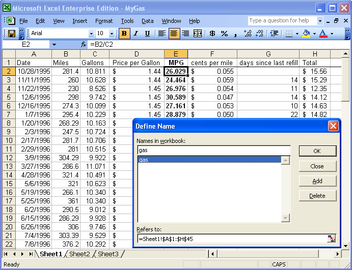 All three samples work with the Excel workbook depicted in Figure 9-2. The file is MyGas.xls. The first four columns of Sheet1 contain manually entered data, and the next four columns contain expressions based on the first four. The formula bar shows the expression for the first value in the MPG (miles per gallon) column. The data resides in a range named gas. The Define Name dialog box shows the extent of the range in Sheet1. The sample application utilizes this named range. When you apply this model application to your data, you will need a corresponding range in your adaptation of the application.