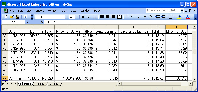 Figure 9-3 shows the five rightmost columns of the output from the preceding sample. The first two columns show identical results for MPG from Excel (the first column) and Access (the second column). The same is true for the total gas bill for each gas fill-up. This confirms that the double and currency data types from Access can duplicate results from Excel.