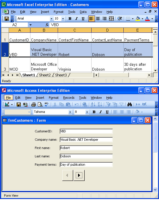 The ability to show Excel data in an Access form is a common request. This functionality enables spreadsheet analysts to work with data in Excel even while your application shows the same data within an Access form. Figure 9-5 shows an excerpt from Sheet1 in the Customers.xls file open above the frmCustomers form from the Chapter09.mdb file. The .xls and .mdb files are open concurrently. The workbook file shows the first customer selected. The Access form displays the same data from a concurrent Access session. The buttons below the text boxes enable an Access user to navigate backward and forward through the Excel data.