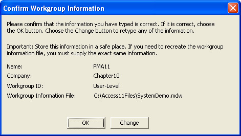 After specifying the values identifying a workgroup and clicking OK, designate path and file names for the workgroup information file in the Workgroup Information File dialog box. If you created an Access11Files folder off your root directory of the C: drive, you could specify C:\Access11Files\SystemDemo.mdw. By default, Access locates .mdw files in the ApplicationData\Microsoft\Access folder for the current user profile. In addition, it names a new .mdw file, Systemx, where x is a sequential number based on the last Systemx.mdw file in the default folder. You can override both the default folder and the file name (as the instructions for this example do). You should record the path and file name. This is because a computer using a database file secured by a workgroup must join the workgroup. In order to accomplish this, a computer user (or at least the application) needs to know the path and file name of the .mdw file. Before creating the workgroup information file, Access gives you a final chance to confirm the workgroup identification field values as well as the path and file names for the .mdw file containing the workgroup information. Figure 10-3 shows the Confirm Workgroup Information dialog box for the current example. It can be convenient to copy the confirmation dialog box image, because if necessary you can use the vital information in this image for re-creating the workgroup information file. Once a new workgroup information file is completed, the current Access session is automatically joined to the workgroup.
