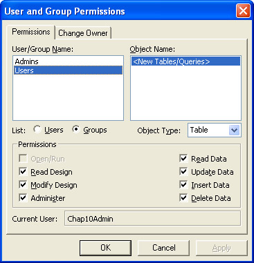 Before adding a table to the database, it is necessary to strip the Admin user and any groups to which it belongs of permissions for new database objects. While the Admin user does not enjoy any direct permissions for new objects in the ManualDemo database, it still belongs to the Users group (recall that you cannot delete the Admin user in a workgroup). By default, Access grants members of the Users group all permissions that apply to any new tables or queries (see Figure 10-5). Since the Admin user belongs to the Users group, it inherits these permissions. Therefore, to strip the Admin user of all permissions for tables, you have to remove all permissions from the Users group. This operation has the side benefit of eliminating unlimited permissions from other users that you may add to the workgroup. You can strip the Users group of all permissions by clicking the Read Design check box. This clears the other check boxes in the dialog box shown in Figure 10-5.