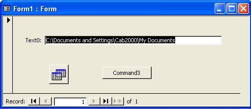 Figure 10-9 shows an Access form with a text box and two buttons. The text box contains the path to the currently selected folder. Showing this path can help someone without authority to map a hard drive—exposing the paths on a hard drive is a step on the way to compromising the security of the files on the hard drive. Form1 also includes two button controls. These controls invoke queries that illustrate other aspects of Jet SandBox operation.