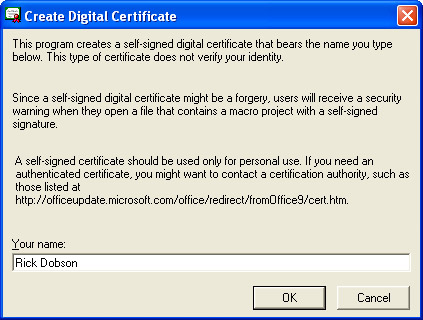 I close the chapter with a demonstration to make macro security and digital signatures easier to grasp. The step-by-step instructions create a digital certificate, use the certificate to sign a VBA project, and open an Access database file with the signed project. You can start the demonstration by creating a digital certificate with selfcert.exe. Begin by opening selfcert.exe, which you can do with the following command sequence: Start, Programs, Microsoft Office, Microsoft Office Tools, Digital Certificate for VBA Projects. Enter your name in the Create Digital Certificate dialog box. Figure 10-10 shows the selfcert program dialog box with my name entered. To run this demonstration, you need to create your own digital certificate using selfcert.exe.