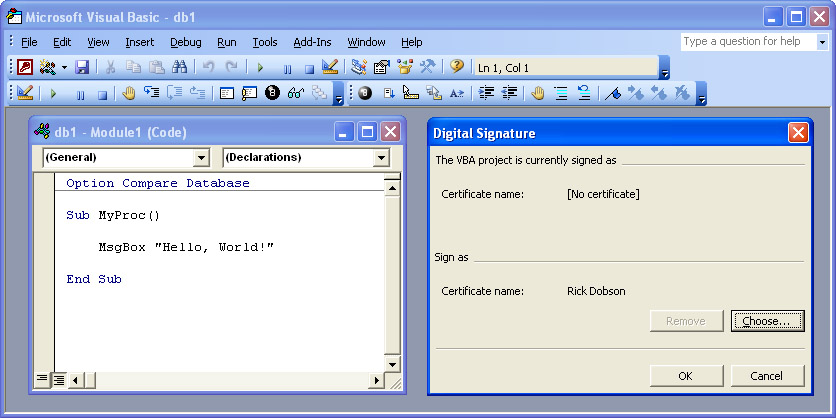 Next, create a new Access database file named db1.mdb with a sub procedure in Module1 that displays via a MsgBox function "Hello, World!" Then, from the Visual Basic Editor choose Tools, Digital Signature. Click Choose in the Digital Signature dialog box to sign the VBA project with the signature created above. You will be prompted to select a digital signature if more than one digital signature is registered on your computer. Next, Click OK to commit your digital signature to the VBA project and close the Digital Signature dialog box. Save your VBA project to persist your signed VBA project to a storage device. The procedure displaying "Hello, World!" and the Digital Signature dialog box appear within Figure 10-11.
