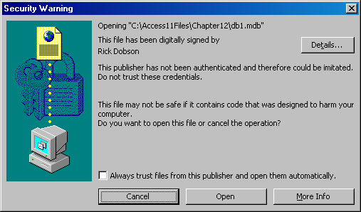 To demonstrate the operation of the digital signature, open a new Access session. Choose Tools, Macro, Security and in the Security dialog box, select Medium macro security. You might receive a prompt to restart Access again for the new security level to take effect. Start a new Access session for the db1.mdb file created as described above. This presents the security warning that appears in Figure 10-12. Click Open to open the Access database file so that you can invoke the code in its VBA project. If you click the check box whose label starts with Always trust files from this publisher, subsequent attempts to open db1.mdb automatically trust the publisher and bypass the Security Warning dialog box. The Cancel button will cancel the file from being opened.