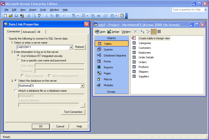 The Data Link Properties dialog box represents the OLE DB connection element of the Access project architecture. It shows that the NorthwindCS database for the Access project resides on a SQL server named CabSony1. You can have other versions of the NorthwindCS database on different servers, but the database names on any one server must be unique. The CabSony1 SQL server in my office network is running SQL Server Developer Edition on a computer running Microsoft Windows XP. The Access project authenticates itself to the SQL server through Windows NT integrated security. Authentication is the process by which a SQL server verifies that a user has permission to access the server. This is the MSDE 2000 default mode of authentication on Windows NT, Windows 2000, and Windows XP computers.