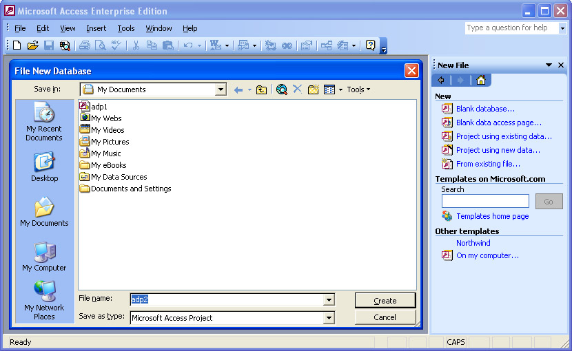 To open a new Access project for an existing database, click the Project Using Existing Data link on the Getting Started task pane. If you do not see the link, click the More link. The Task Pane opens by default when you start Access 2003. Clicking the Project Using Existing Data link opens the File New Database dialog box (see Figure 11-3). Access assigns a default name to the Access project file in the style of adpx.adp. You can override adpx with a custom name of your choice, and you can change the destination folder for the file by changing the selection in the Save In drop-down list. By clicking Create in the dialog box shown in Figure 11-3, the user creates an Access project with a filename of adp2.adp in the My Documents folder.