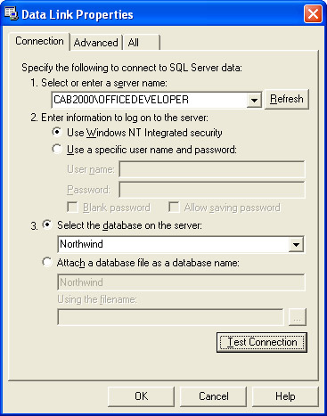 At this point, the project has no connection to a database. Therefore, Access automatically opens the Data Link Properties dialog box. Fill in the server name, user authentication information, and database name to link the project to a database. Figure 11-4 shows a completed Data Link Properties dialog box that connects an Access project to the Northwind database on the OfficeDeveloper SQL Server instance on the cab2000 server with Windows NT integrated security. Windows NT integrated security becomes particularly convenient when organizations can readily manage a single login account for Windows and SQL Server.