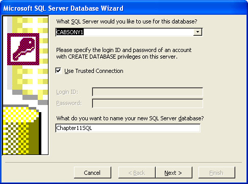 Figure 11-5 shows an example of a completed dialog box for creating a new database. This dialog box specifies the local server. This example assumes you have SQL Server or MSDE 2000 running on the local server. The drop-down list that initially displays "(local)" enables you to select the name of any other SQL server to which you are connected. To connect to an instance of MSDE 2000 running on a Windows 98 computer, you must type the name of the server into the box. Notice that you can use either a trusted connection or an account with CREATE DATABASE privileges on a server. Your Windows account has these privileges if you install SQL Server on your computer with the default selections. This example selects the Use Trusted Connection check box, which designates the Windows account of the person attempting to create the database. Chapter 10 will discuss SQL Server security, including accounts and permissions. The database creation wizard automatically names the database after the Access project by appending a suffix of SQL to the Access project name. In this case, the resulting name for the new database is Chapter11SQL. You can override this default name with any other you prefer.