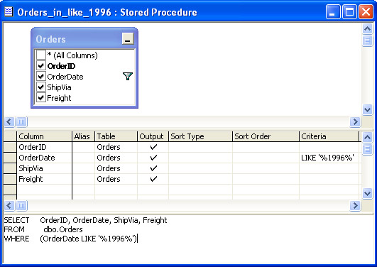 Figure 11-18 shows the Design view for a stored procedure named Orders_in_like_1996. It uses the LIKE operator to specify a criterion for OrderDate column values. The rows with OrderDate column values that include 1996 pass through the filter for membership in the stored procedure's result set. Recall that SQL Server represents datetime values internally as numbers, but it displays and filters them as string values. This feature makes it possible to use the LIKE operator to filter rows based on their column values.