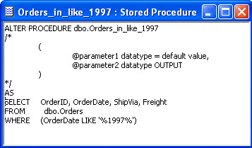 ALTER PROCEDURE Orders_in_@year @year int AS SELECT OrderID, OrderDate, ShipVia, Freight FROM Orders WHERE DATEPART(yyyy, OrderDate) = @year