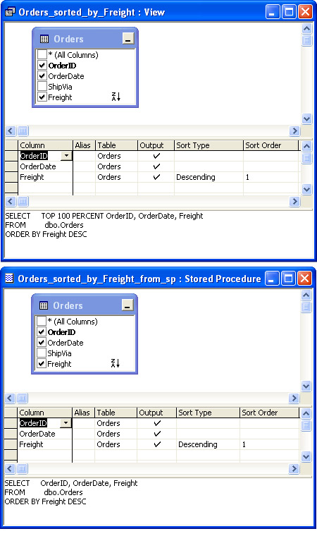 Figure 11-21 presents two Design views. The top window shows a view, and the other shows a stored procedure. Both the view and the stored procedure sort the Orders table rows by freight in descending order. The top window, for the view, shows the TOP clause. Notice that you have to choose the top 100 percent—namely all the rows in the result set. It doesn't make sense to do this other than for the fact that the syntax requires this formulation to enable sorting within a view. With the stored procedure, you can simply specify an ORDER BY clause for the columns on which you need to sort a result set. In addition, the stored procedure formulation (shown in the next sample) lends itself to an extension that isn't possible with a view.