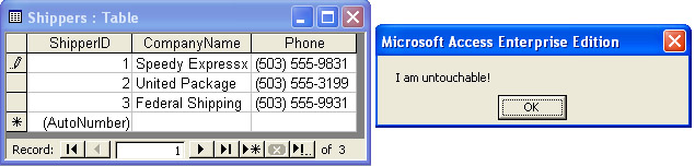 The next T-SQL script shows the text of a trigger for the Shippers table that blocks all changes to the table. Users can still open the table and examine its contents. However, if they try to change the table by inserting a new record, updating an existing record, or deleting a record, the trigger rolls back the action and prints a message that says, "I am untouchable!" The ROLLBACK TRAN statement rolls back any attempt to modify the table, and the RAISERROR statement presents a message to Access from SQL Server.