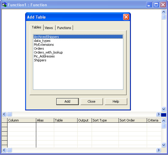 Because an in-line function depends on a single SELECT statement, Access 2003 offers a graphical design tool that is very similar to the visual designer for views. You can create an in-line function by selecting Queries in the Objects bar on the Database window and clicking New. Then you double-click Design In-Line Function. This opens the visual designer for in-line functions that appears in Figure 11-25. Notice that you can use tables, views, and other table-returning functions as sources for in-line functions. You can build the query similarly to the way you build a view, but you can specify criteria with parameters (as with stored procedures). In addition, the View drop-down menu on the toolbar offers a SQL View option as well as a SQL pane. With the SQL pane, you can see the T-SQL syntax for the SELECT statement underlying an in-line function's graphical view. With the SQL View window, you can see the full ALTER FUNCTION statement defining the in-line function.