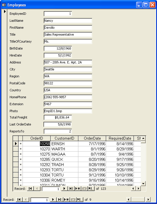 Figure 12-4 shows an adaptation of the form depicted in Figure 12-3. The new form has the name frmEmployees1. The adaptation drops the Notes text box and adds two others in its place. The Notes text box in frmEmployees is bound to the Notes column in the Employees table. The two new text boxes are both unbound. Their captions are Total Freight and Last Order Date.