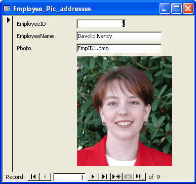 Figure 12-5 shows the frmEmployee_Pic_addresses form with the image of the first employee. Users can move through the records with the normal navigation controls at the bottom of the form. With each new record, the image changes. The table contains only nine records. As a developer, you can add new employees and photo addresses to the table to enable the form to show additional employee pictures. With a very modest amount of code, you can enable end users to add images for display on the form.