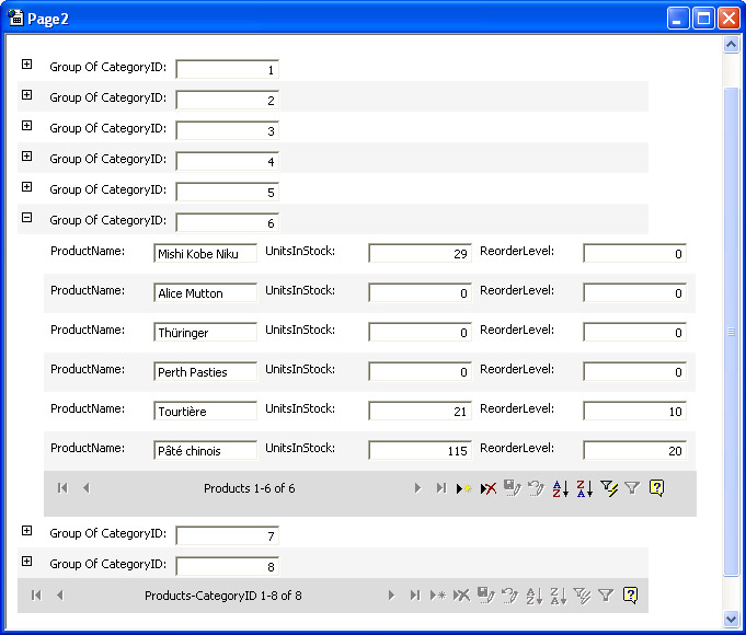 Notice that the report contains two navigation bars. The one with the label of Products 1–6 Of 6 is the inner navigation bar. This bar does not appear unless a user expands at least one CategoryID group. By default, the maximum number of records that the bar shows at one time is 10. You can increase or decrease this amount by using the Properties dialog box for the navigation bar. The outer navigation bar appears whenever the data access page opens. Again, all 8 category ID values show at one time since there are fewer than 11.