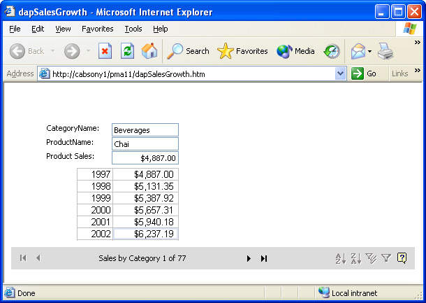 Figure 14-21 shows one use of a spreadsheet component (or control) on a data access page in a browser (see dapSalesGrowth.htm in this book's companion content). Controls on the page show the CategoryName, ProductName, and ProductSales fields for the Sales By Category query in the sample database. The query is excerpted from the Northwind database sample. This query computes sales by product in 1997 for each product. The query lists the category ID and name of each product along with its sales.