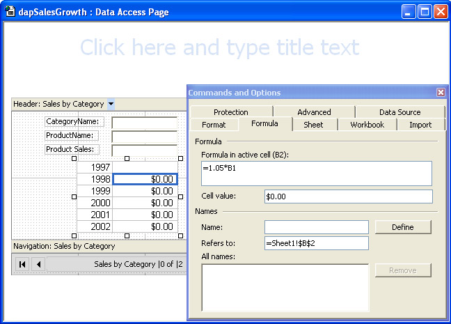 Figure 14-22 shows the Design view of the data access page in Figure 1421. In the current figure, cell B2 is selected on Sheet1. This is one row below the row populated by the preceding event procedure. In addition, the Commands And Options dialog box for the spreadsheet component appears. The Formula tab on this dialog box displays any formula for the currently selected cell. In this instance, the formula computes the value in cell B2 so that it is 5 percent greater than the value in cell B1. Cells B3 through B6 contain formulas that yield progressively larger values than those from the preceding years. As you can see from the values in column A, these rows represent successive years.