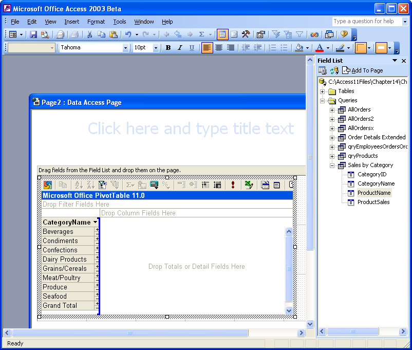 Pivot tables are typically used by financial, operational, and decision-support analysts. An Access developer's job often involves setting up the data source for the PivotTable list control, such as the Sales by Category query for the two displays in Figure 14-26, and assign it to a PivotTable list control as described earlier. You can also set up a starter report in a PivotTable list control to introduce users to the resources that it exposes. You can create a starter report from a page's Design view with simple graphical techniques (a programmatic approach is demonstrated in the next section). Click the Help button for a review of how these techniques work. The power of a report based on a pivot table is that a user can easily modify the report without help from a developer. By putting the PivotTable list control on a Web page, you increase its availability to prospective users so that they can create their own report variations even when they are unable to physically connect to a LAN.