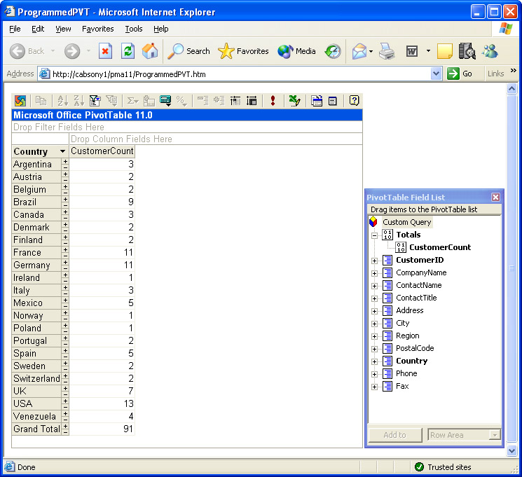 The sample for this section demonstrates how to automatically populate a PivotTable list control on a Web page. In addition, the sample performs an aggregation and hides the details used to compute the aggregations. Figure 14-28 displays the PivotTable list control along with its Field List on a page in a browser. The page reports the number of customers in each country from the Customers table in the Northwind.mdb file. Because the data source for the control is the Customers table, a user can respecify from a browser the participation of any field in a row, column, or filter drop area. Attempting to open this page on a Windows XP computer with the default security settings will raise a security fault that blocks the display of the page if you designed the page with the manual design techniques described in the "Creating and Using Office PivotTable Lists" section of this chapter. However, programming the solution as demonstrated here allows the page to show with the default Windows XP security settings.
