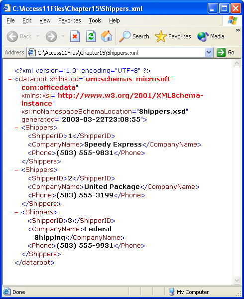 Figure 15-3 shows an XML document based on the Shippers table in an Internet Explorer browser. This document was generated through the Access UI. The Shippers table was imported, along with the Customers and Orders tables, to the Chapter15.mdb file from the Northwind.mdb file. The <dataroot> tag is immediately after the declaration tag for the XML document. Within the <dataroot> tag, three attributes point to XSD schemas for the document. These schemas can define elements and attributes in the remainder of the Shippers.xml file. The Shippers.xsd schema file appears in the same folder as the Shippers.xml document file. You can refer to schemas in other folders and at Web-based URLs as well. To refer to a file-based URL, use the following format: file://DriveLetter://path/filename.fileextension.