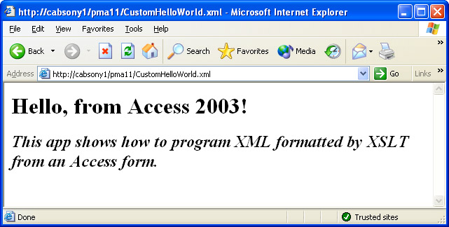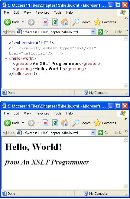 As you begin to migrate to XSLT, I urge you to think in terms of recycling and tweaking XSLT code samples that do much of what you want done. This section demonstrates this approach. First, I describe and demonstrate the operation of a Hello, World! sample from the MSDN site (http://msdn.microsoft.com /library/default.asp?url=/library/en-us/xmlsdk/htm/xslt_starter_2uhw.asp). Then I adapt and extend the sample to illustrate how you can modify its output and run it from an Access form. While this demonstration is not based on a database, it does show you how to use XSLT with an Access form. In the "Programmatically Using XML from Access 2003" section, I will revisit XSLT and show you how to programmatically format Access tables for output in HTML pages. The sample in this section even opens the HTML page automatically.