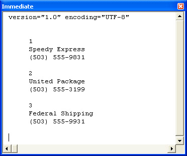 Although the printout of the XML in an XML document is informative because it includes all the tags along with their values, the tags can be distracting. It is sometimes more useful to present just the column values for each row delimited by something, such as a blank line, to separate rows of column values. The next listing illustrates one approach to this task. The sample application consists of three procedures, one of which is the ReadXML function procedure described in the preceding sample. Therefore, the next listing shows just two procedures. The application prints to the Immediate window the contents of each column for successive row values from the Shippersp1.xml document. In between successive rows, the sample prints a blank line. Figure 15-11 displays the output. While the listing applies to the Shippersp1.xml file, it can process the contents of any table from an Access database file or an Access project via the ExportXML method or a manual technique for creating an XML document based on an Access database object. The sample returns the values of elements. Therefore, if your XML document stores its values in attributes, such as MyShippersWithAttributes.xml from the "XML Document Syntax" section of this chapter, you should modify the sample.