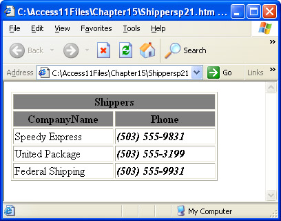 Figure 15-12 shows the table in a browser generated by Shippersp21.htm invoking Shippersp21.xsl to transform Shippersp2.xml. You can best appreciate the impact of the custom XSLT file by contrasting Figure 15-12 with Figure 15-9. Recall that Figure 15-9 shows the Shippers table with the standard XSLT transformation provided by Access. The custom XSLT selects a subset of the columns, which exclude ShipperID, and it applies special formatting in the table header area as well as in the Phone column.