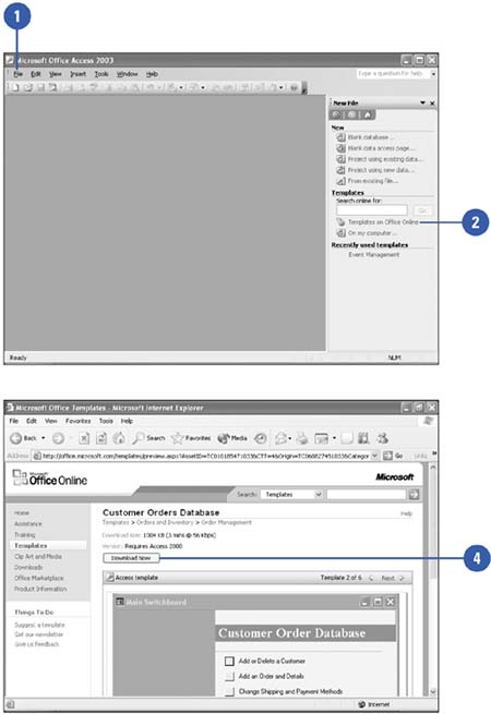 The quickest way to create a database is to use a template, which you can find on the Office Online Web site. Office Online provides database templates on a variety of subjects, including finance, inventory control, and order status. The New File task pane contains a link to access the templates area on the Office Online Web site. You can browse the site for templates, and then download the ones you want. Before you start the downloading process, be sure to carefully read the download and any installation instructions. Some of the templates on the site were created for earlier versions of Access, but you can use them with Office Access 2003.